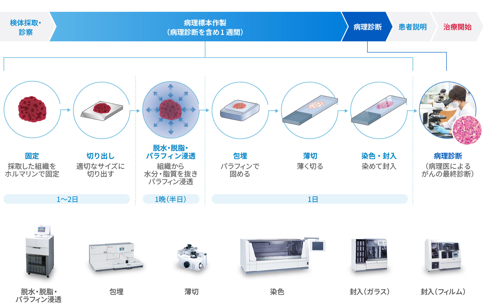 病理標本は、多くの工程を経て作製されます。各工程の内容を説明します。